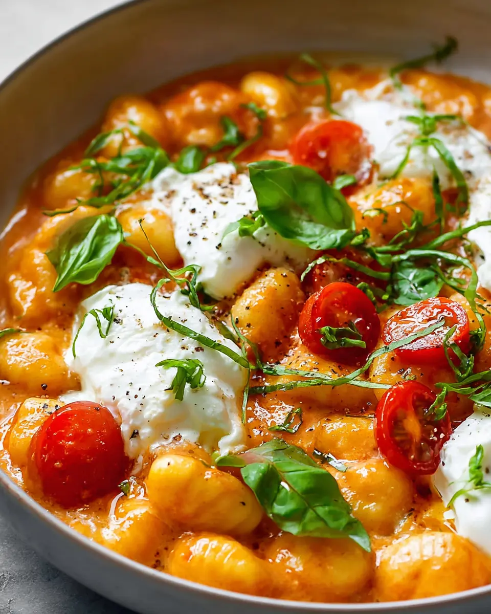 To bring this 30 Minute Creamy Tomato Gnocchi to its delectable zenith, gently break apart 2 (4-oz.) balls of fresh burrata cheese and distribute the creamy goodness across the dish. The burrata adds an irresistible texture and rich flavor. Finally, remove the skillet from the heat, adorn your creation with the reserved fresh basil, and marvel at the deliciousness you've crafted in just half an hour!