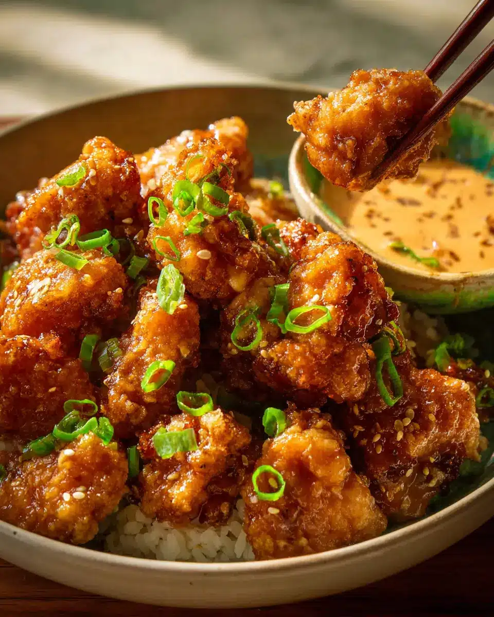 Finally, it’s time for the best part—tossing that beautifully fried chicken in your prepared Bang Bang sauce! Gently mix until the chicken is thoroughly coated. For a decorative touch (and extra flavor), garnish with thinly sliced scallions if desired. Serve immediately with the remaining sauce on the side for your guests to enjoy!