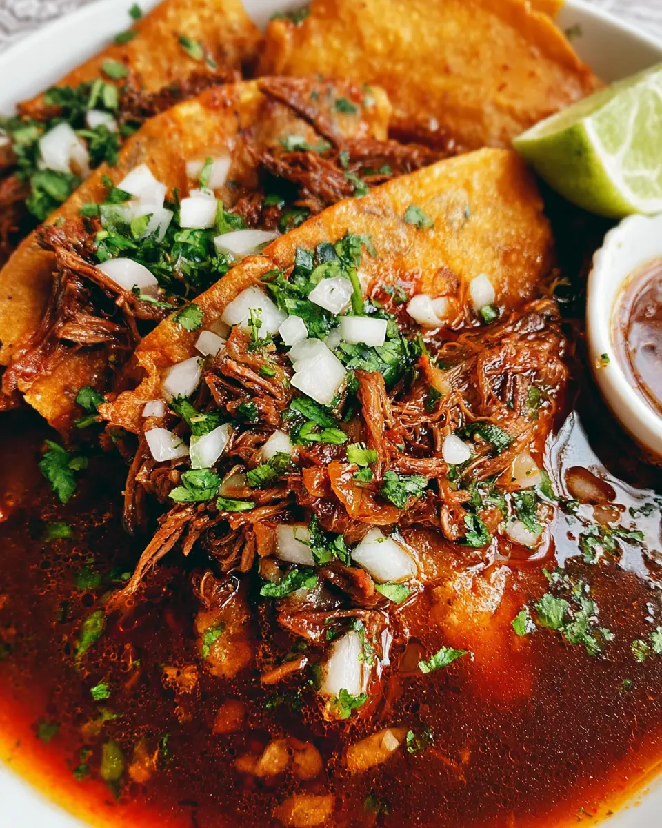 Feeling adventurous? Transform your birria recipe into mouthwatering tacos! Simply shred the beef and layer it into corn or flour tortillas. Top with diced onions, cilantro, and a drizzle of your favorite salsa. For an extra treat, dip each taco in the consommé before taking a bite. It's a fun and flavorful way to enjoy this classic dish—perfect for gatherings or a cozy night in!