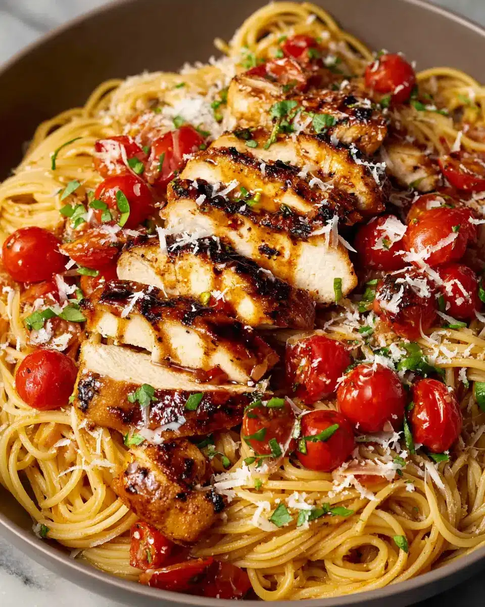 With the pasta fully cooked, it’s time to bring our dish to the finish line. Turn off the heat and taste your creation; feel free to add more kosher salt if you desire. Slice the chicken into thin pieces and place it atop the delicious pasta. Drizzle any juicy remnants left from the chicken over the top for extra flavor. Finally, garnish with the remaining diced Roma tomatoes, more chopped basil, and optional grated Parmesan cheese for that finishing touch. If you’re feeling adventurous, drizzle with balsamic glaze for a gourmet flair.