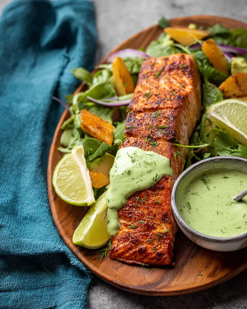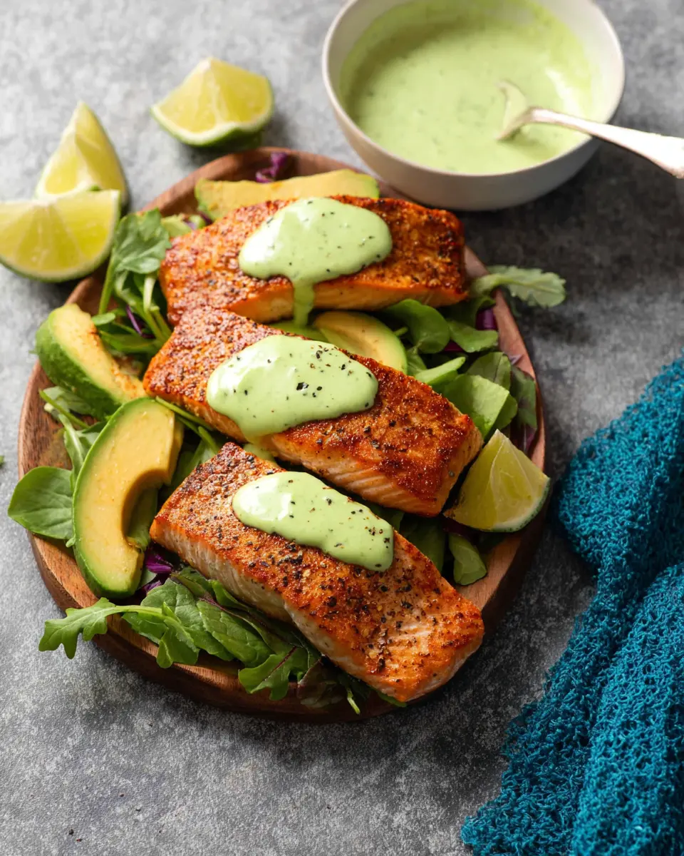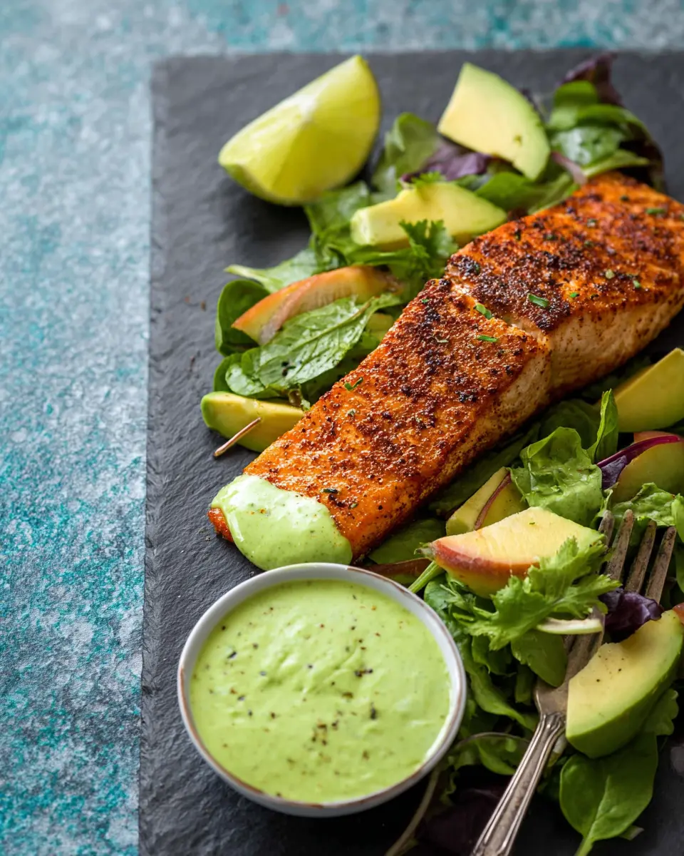 Cajun-Spiced Baked Salmon with Avocado Lime Sauce