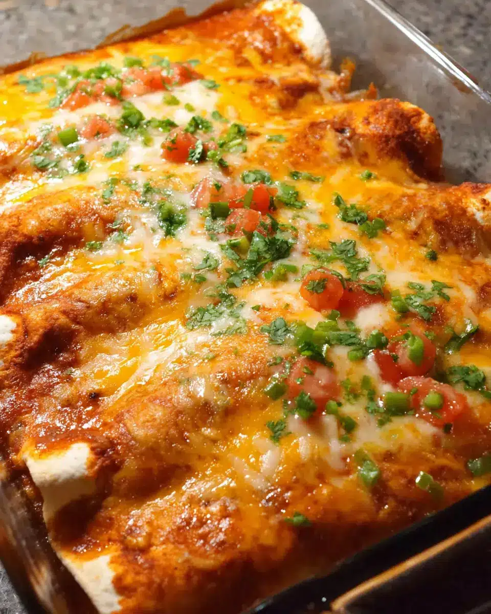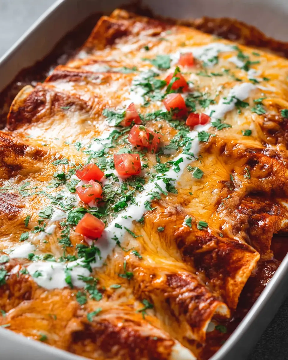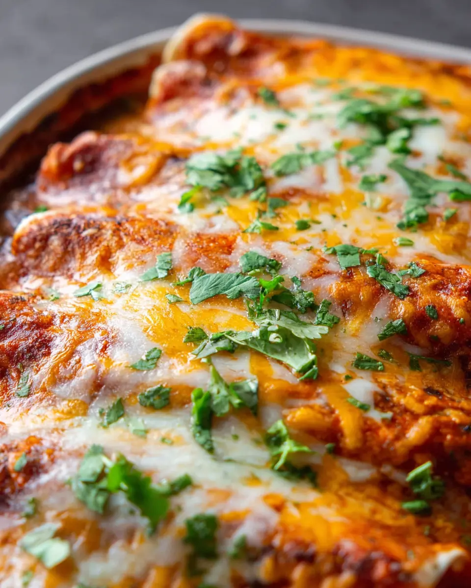 Pour the remaining enchilada sauce over your rolled enchiladas and sprinkle with more cheese. Bake for 20–25 minutes, until the cheese is melting and golden. Serve hot, topped with fresh coriander. Enjoy your homemade chicken enchiladas! They’re sure to become a beloved recipe in your kitchen, as comforting and satisfying as a hug on a plate.