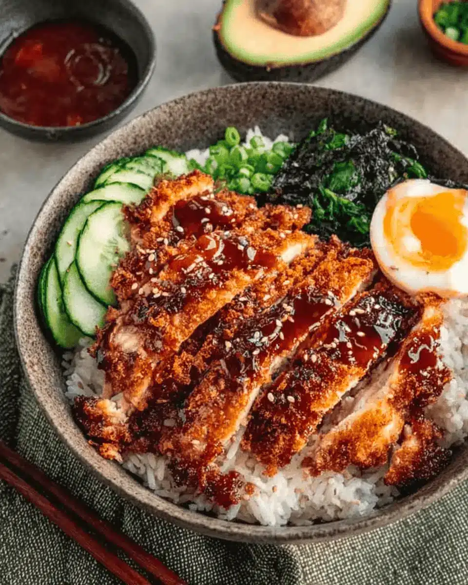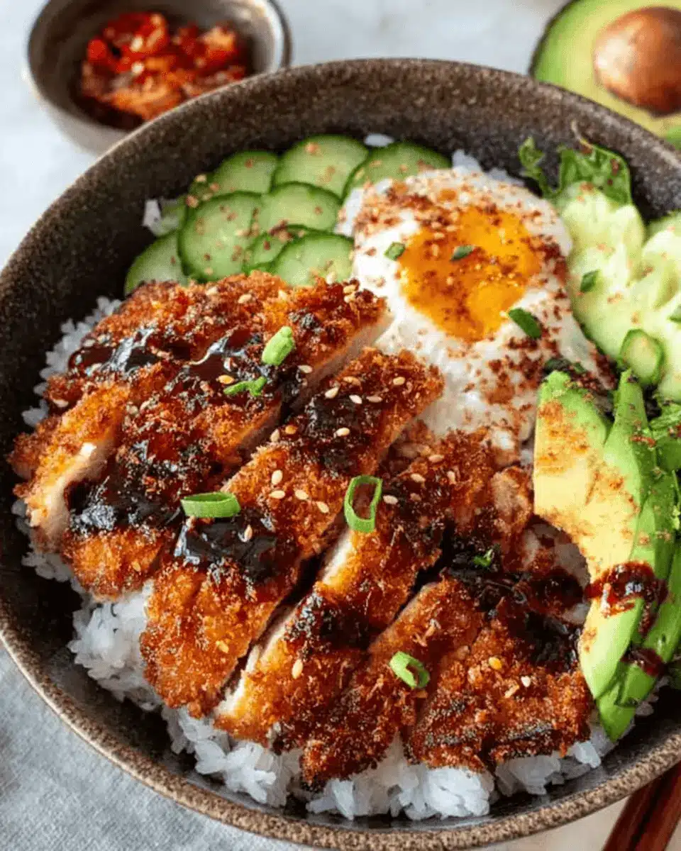 - Divide the cooked rice between serving bowls. Top with sliced katsu chicken, avocado, and cucumber. Drizzle with tonkatsu sauce and sprinkle with sesame seeds to serve.