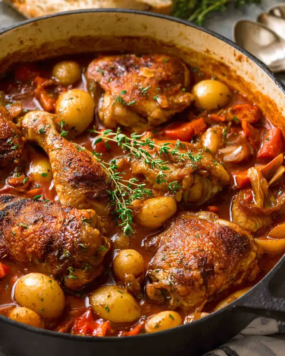 To serve, taste the sauce and adjust seasoning as needed. Your warm chicken stew is ready to enjoy, perhaps paired with some crusty bread to soak in all that goodness! If you’re looking to elevate your dish even further, consider adding some fresh herbs for that extra pop of flavor.