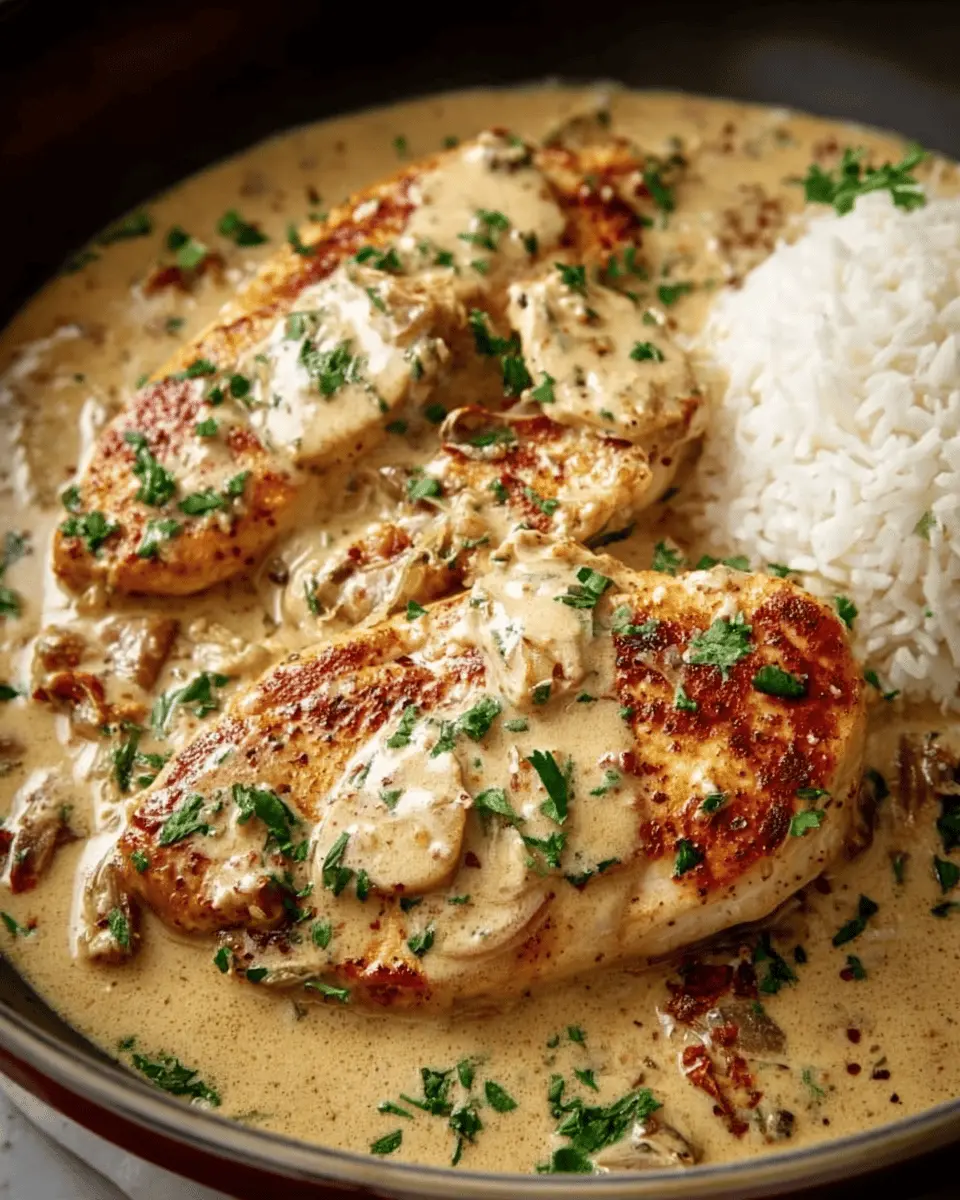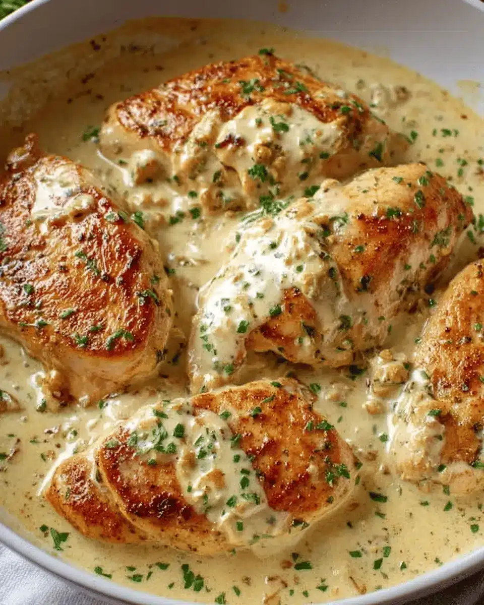 - Finally, return the cooked chicken breasts to the skillet and spoon the creamy sauce over top. Allow the chicken to heat through. Serve with fresh chopped parsley (optional), and enjoy!
