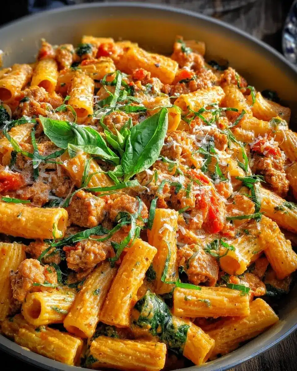 Customizing this dish is easy! You can swap the Italian sausage for turkey sausage for a leaner version. Additionally, consider using whole wheat rigatoni for a healthier alternative. If you're looking for a dairy-free option, try coconut milk instead of heavy cream and omit the cheese. Fresh spinach can be replaced with other greens like kale or arugula for a different flavor profile.