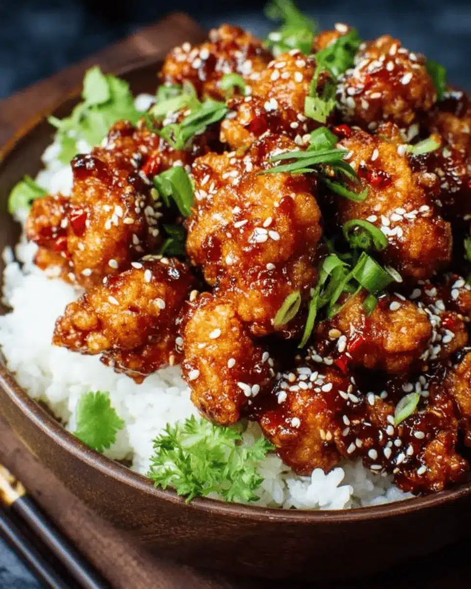 Finally, serve your crispy sesame chicken over boiled rice, garnishing with sesame seeds and spring onions for that extra touch. Trust me; your taste buds will thank you!