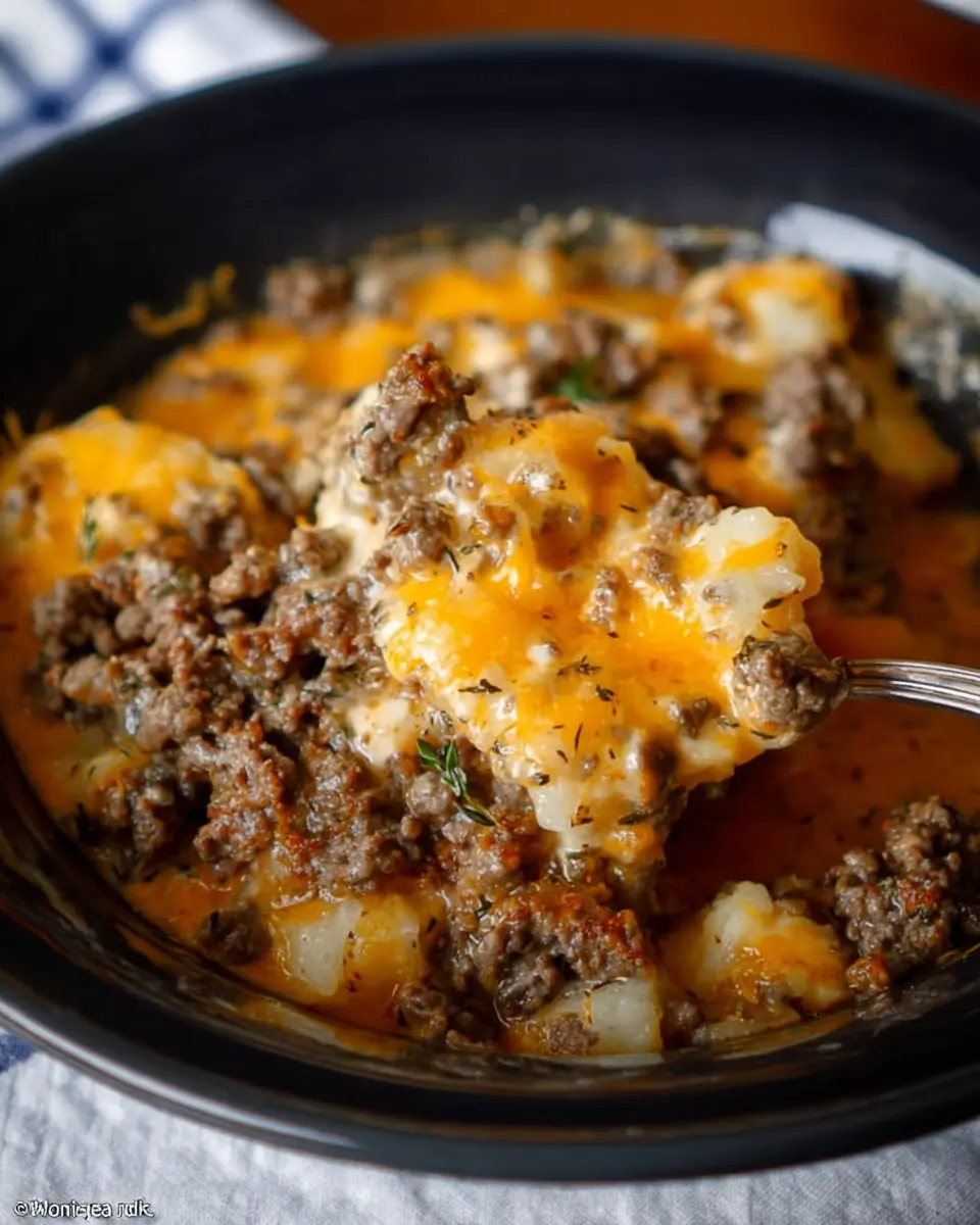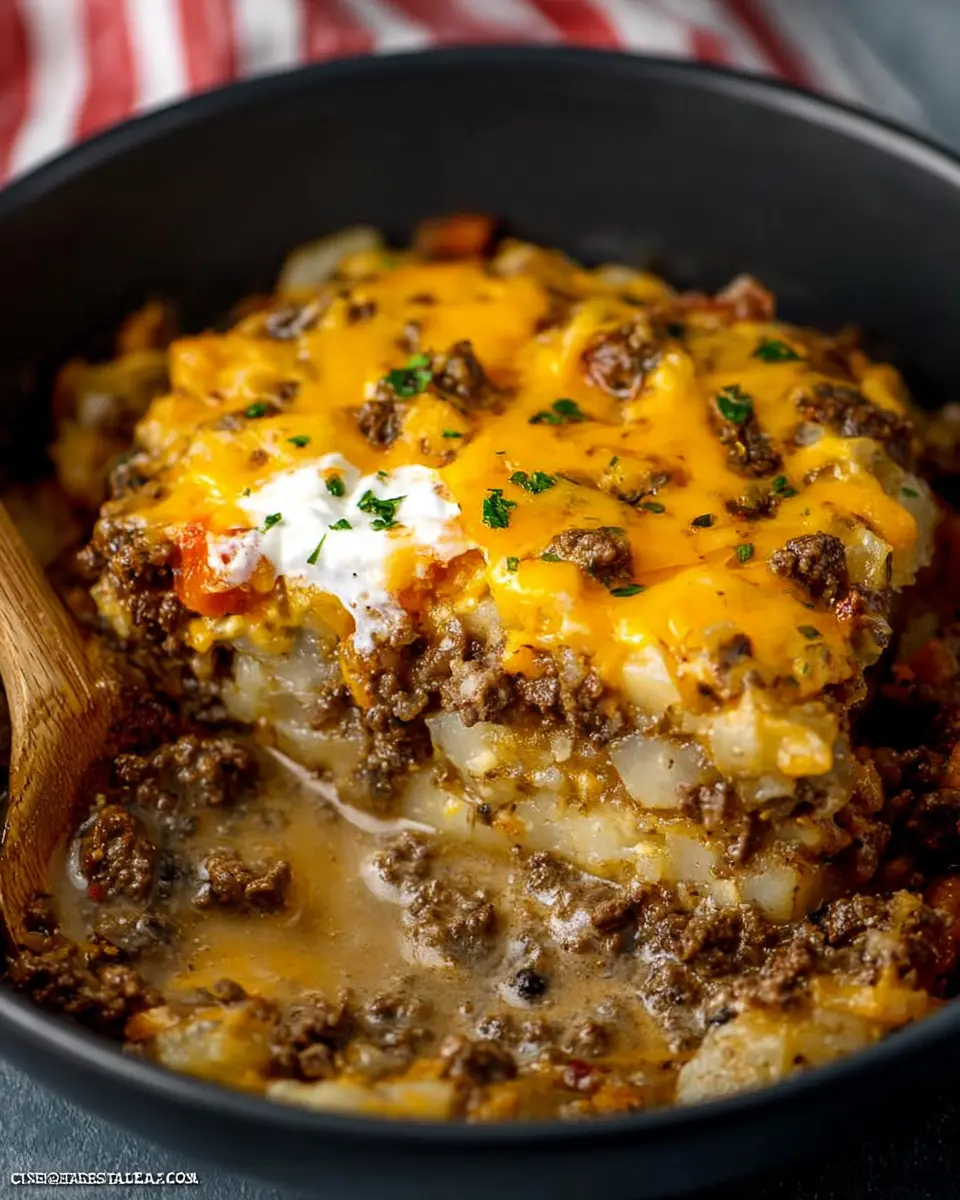 In a mixing bowl, you’ll create the rich and creamy mixture that binds everything together. Combine 2 cans of cream of mushroom soup with 1 cup of milk, stirring until smooth. Feel free to adjust the consistency—if you like it creamier, add a splash more milk! Season your soup base with salt and pepper to taste, as these spices play a crucial role in elevating the overall flavor of your Crock Pot Hamburger Potato Casserole Recipe.