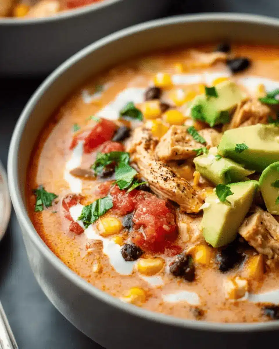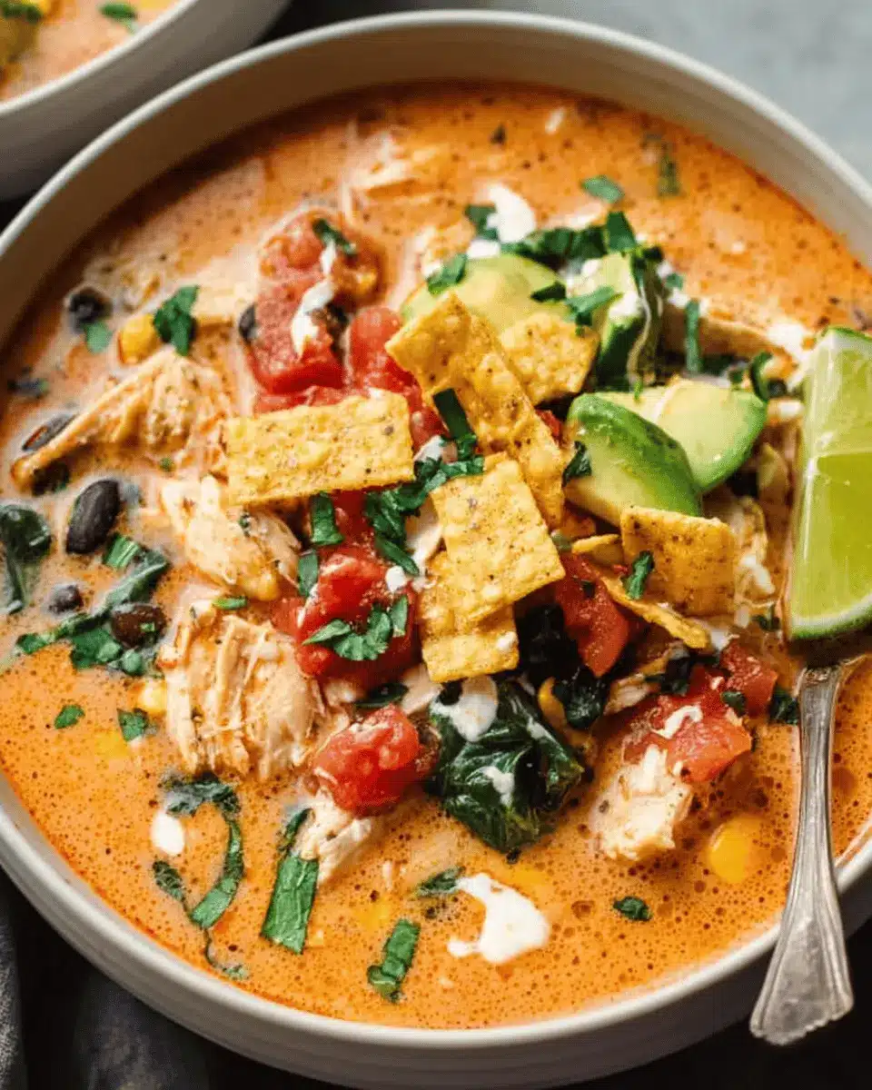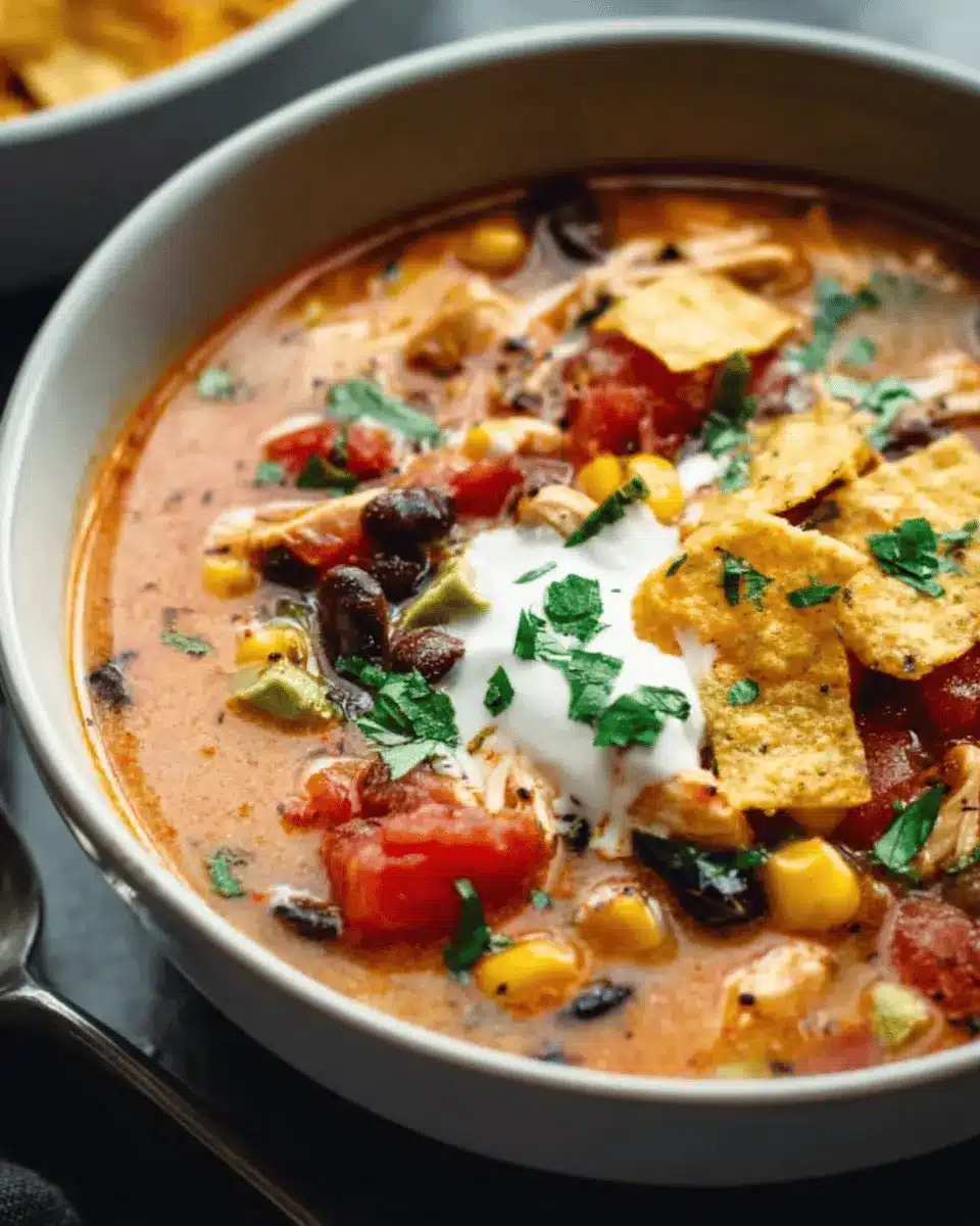 Last but not least, stir in 2 cups of shredded cooked or rotisserie chicken. Let it cook for another 5 to 7 minutes until everything is warmed through. Don’t forget to season your soup with salt and pepper to taste. Serve it hot with your favorite toppings like avocado, tortilla strips, or a sprinkle of cheese.