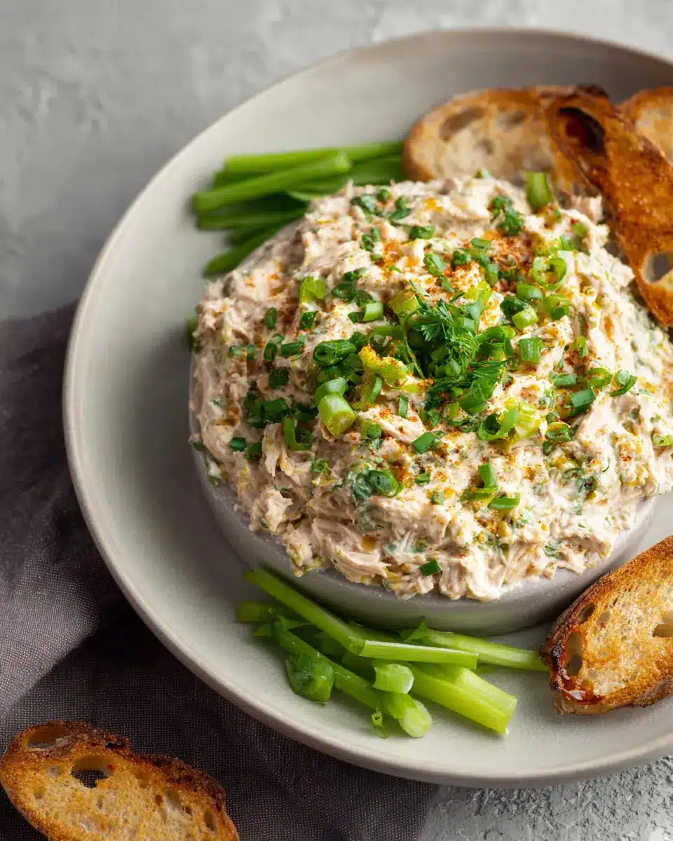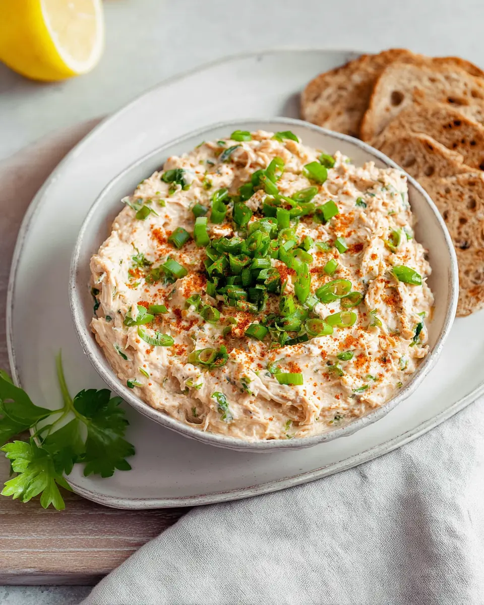 Your easy tuna dip is almost ready to shine! Transfer it to a shallow serving bowl, spreading it out to create a lovely presentation. For that extra touch, garnish with a sprinkle of parsley, some sliced spring onion tops, or even a few capers for a briny punch. This dip pairs perfectly with veggie sticks, crackers, or even a slice of crusty bread.