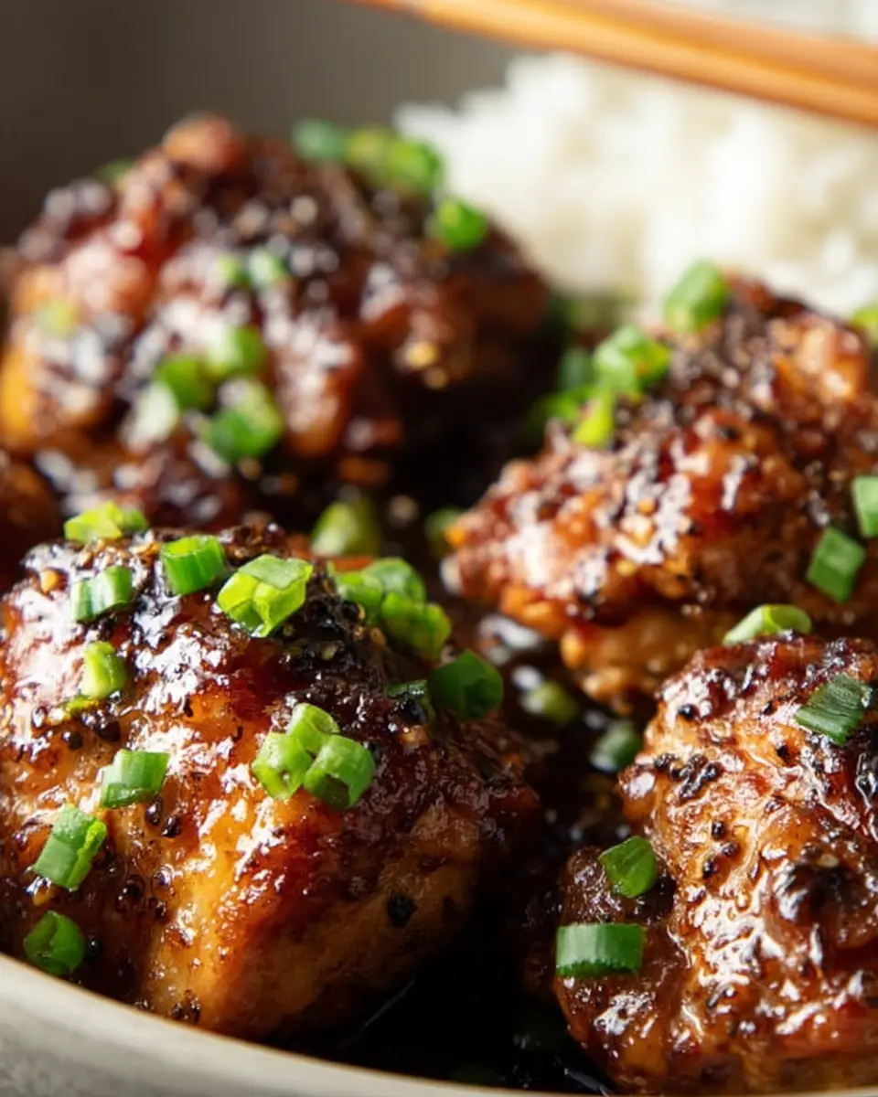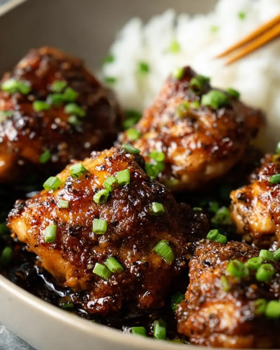 Your honey black pepper chicken thighs are now ready to be served! Perfect over rice or noodles, and topped with green onions, this dish is a surefire way to impress at dinner—no takeaway required. Enjoy!