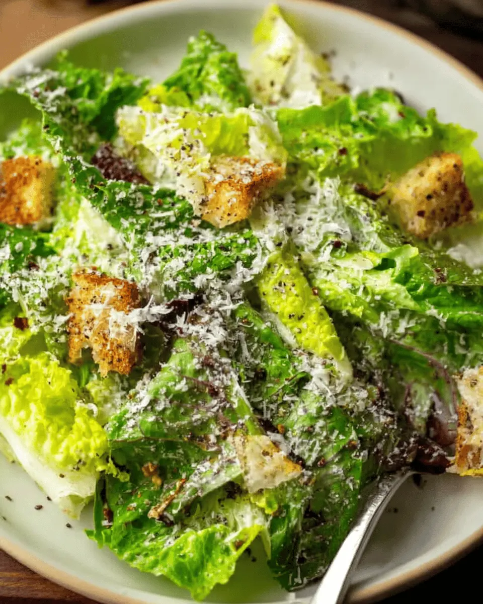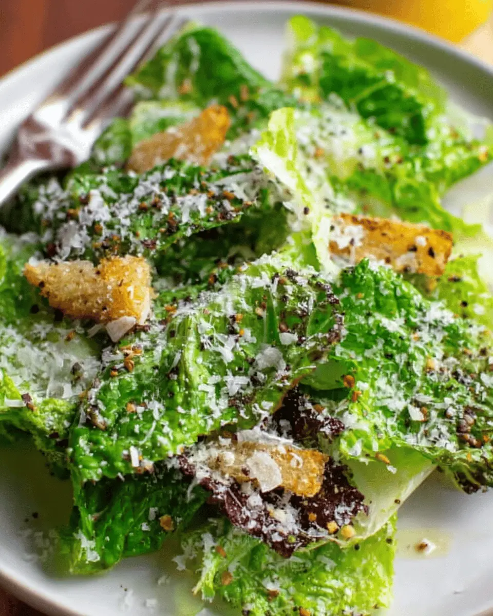 Finally, sprinkle 1 cup of finely grated Parmesan cheese over the salad, and for those who enjoy a little kick, I recommend adding some crushed red pepper flakes or Aleppo pepper. Gently toss the salad until every leaf is coated with the dressing and cheese. It’s now ready to serve! Remember, this salad is best enjoyed immediately to keep the greens crisp.