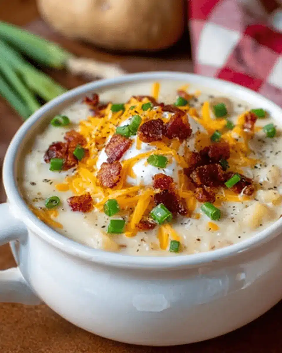 Absolutely! Loaded Baked Potato Soup actually tastes even better after a day in the fridge. Simply prepare the soup as directed, allow it to cool, and store it in an airtight container. When you’re ready to enjoy it, just reheat on the stove over low heat until warm. You may want to add a splash of milk to restore its creamy texture.