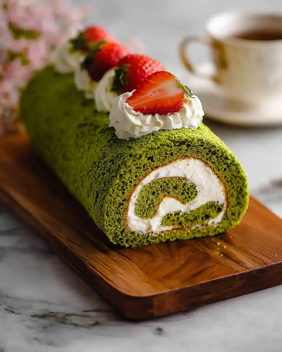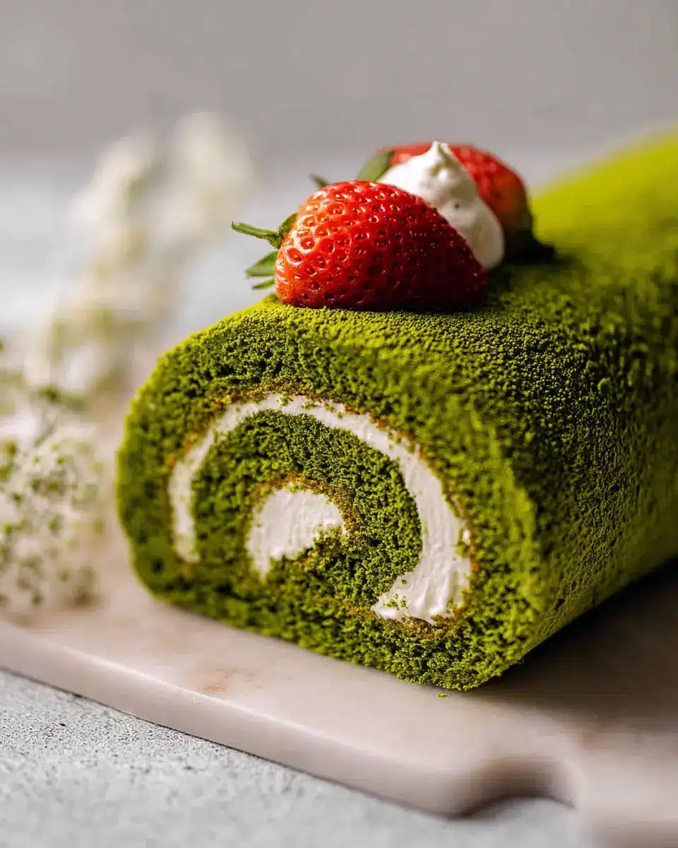 Finally, carefully transfer the cake to a clean piece of parchment paper, with the brown skin side facing up for that classic green appearance when served. Spread an even layer of whipped cream over the cake and lay a row of fresh strawberries on one end. Using the parchment paper as a guide, roll the cake tightly, finishing with the seam side down. Wrap it up and chill it in the fridge to firm up before slicing.