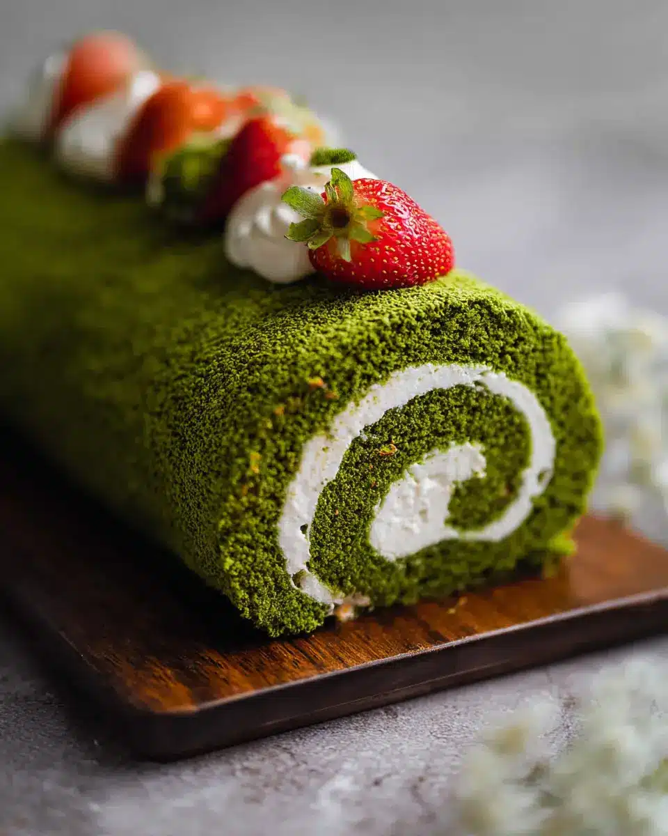 The beauty of a Matcha Swiss Roll lies in its aesthetics and flavor profile: the soft, spongy cake envelops a luscious cream filling, often enhanced with fresh fruits like strawberries. It’s an ideal canvas for your creativity. Interested in making this masterpiece? Let’s dive into the recipe where you’ll whip up your very own Matcha Swiss Roll Cake!