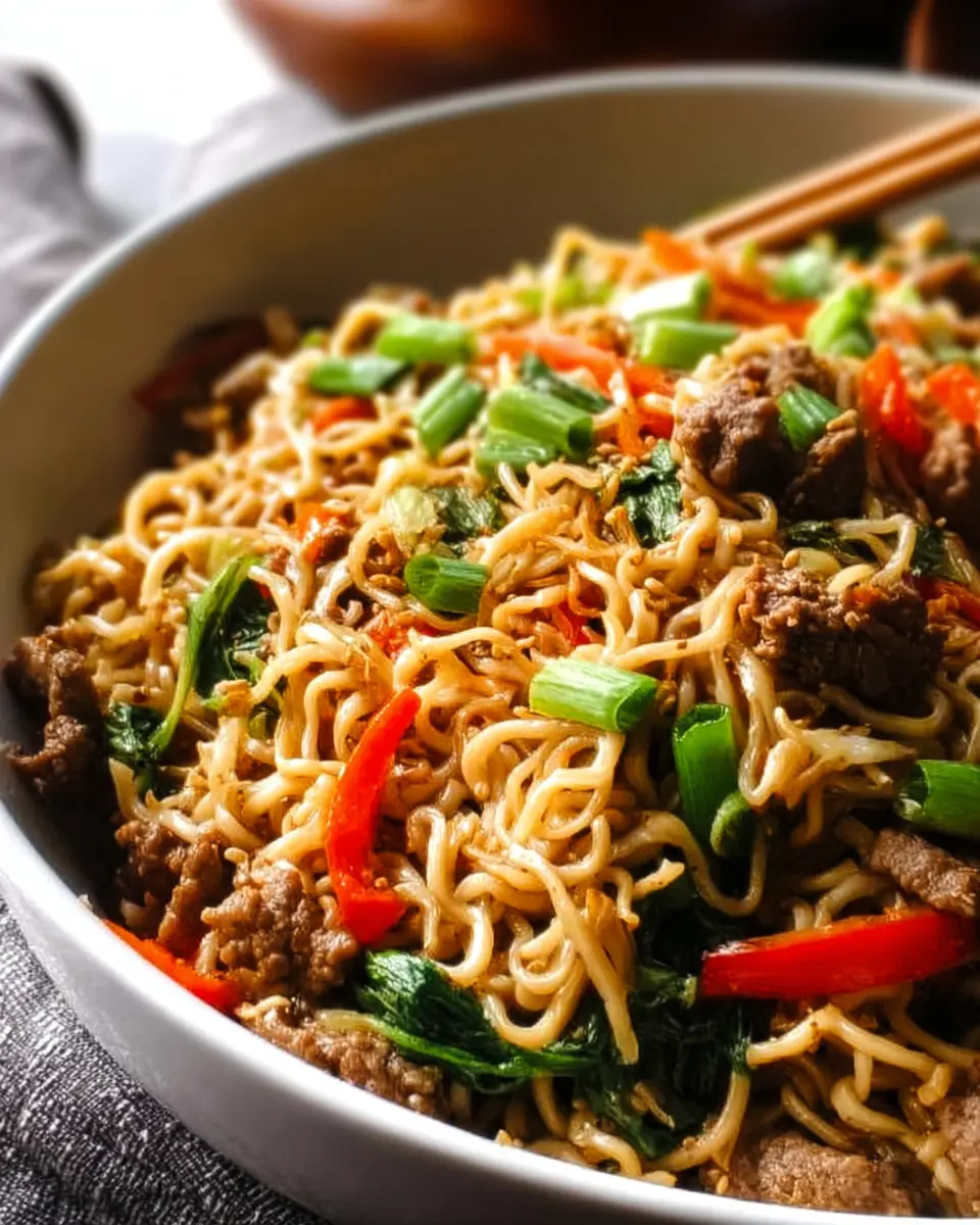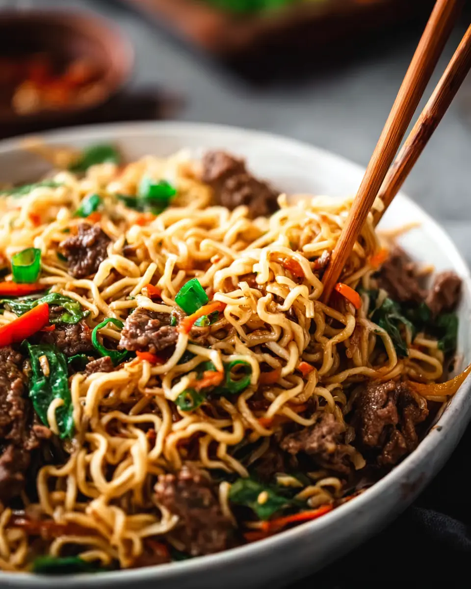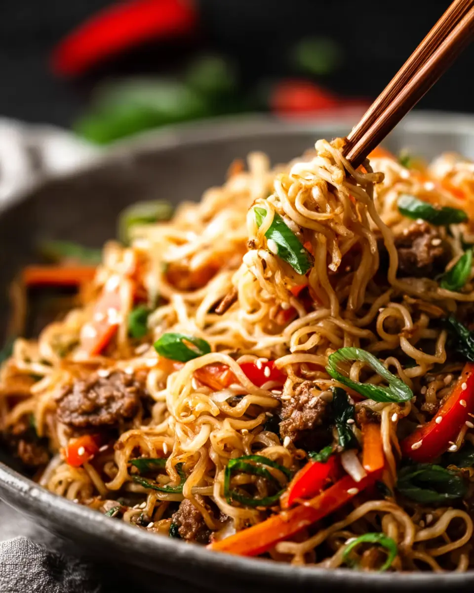 Traditional Mongolian Noodles are typically made with stir-fried ingredients combining meat, vegetables, and seasoned noodles. In our recipe, we use ramen, ground beef, and vibrant vegetables like carrots, bell peppers, and snap peas. The dish is often enhanced with a flavorful sauce made from soy sauce, hoisin, and ginger, creating a delightful balance of savory and sweet.