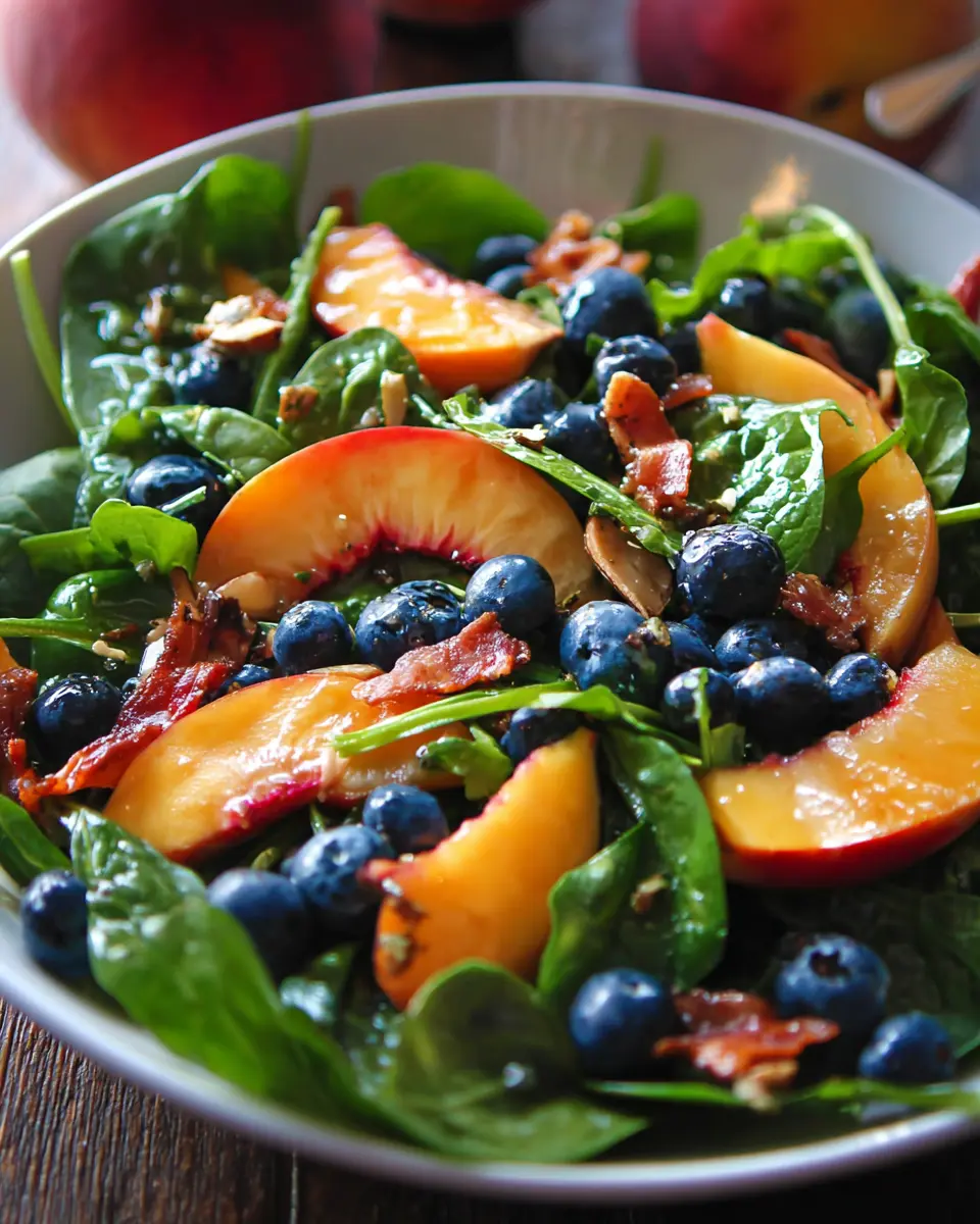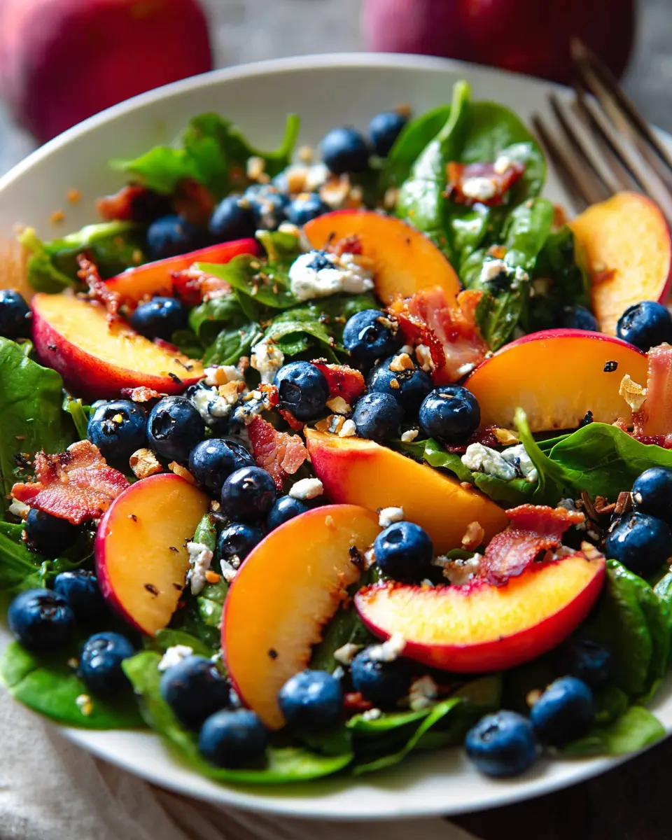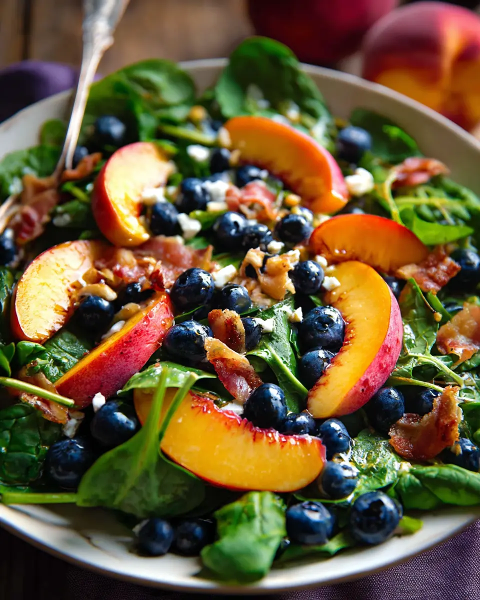 The Peach Blueberry Spinach Salad is as versatile as it is delicious. Pair it with grilled chicken or turkey bacon for a healthy protein boost. A light, sparkling water infused with citrus makes an excellent refreshing drink alongside this salad, enhancing its fruity flavors. If you’re hosting a gathering, consider serving it as a side dish with barbecued meats or alongside a cheese platter featuring crumbled feta or goat cheese.