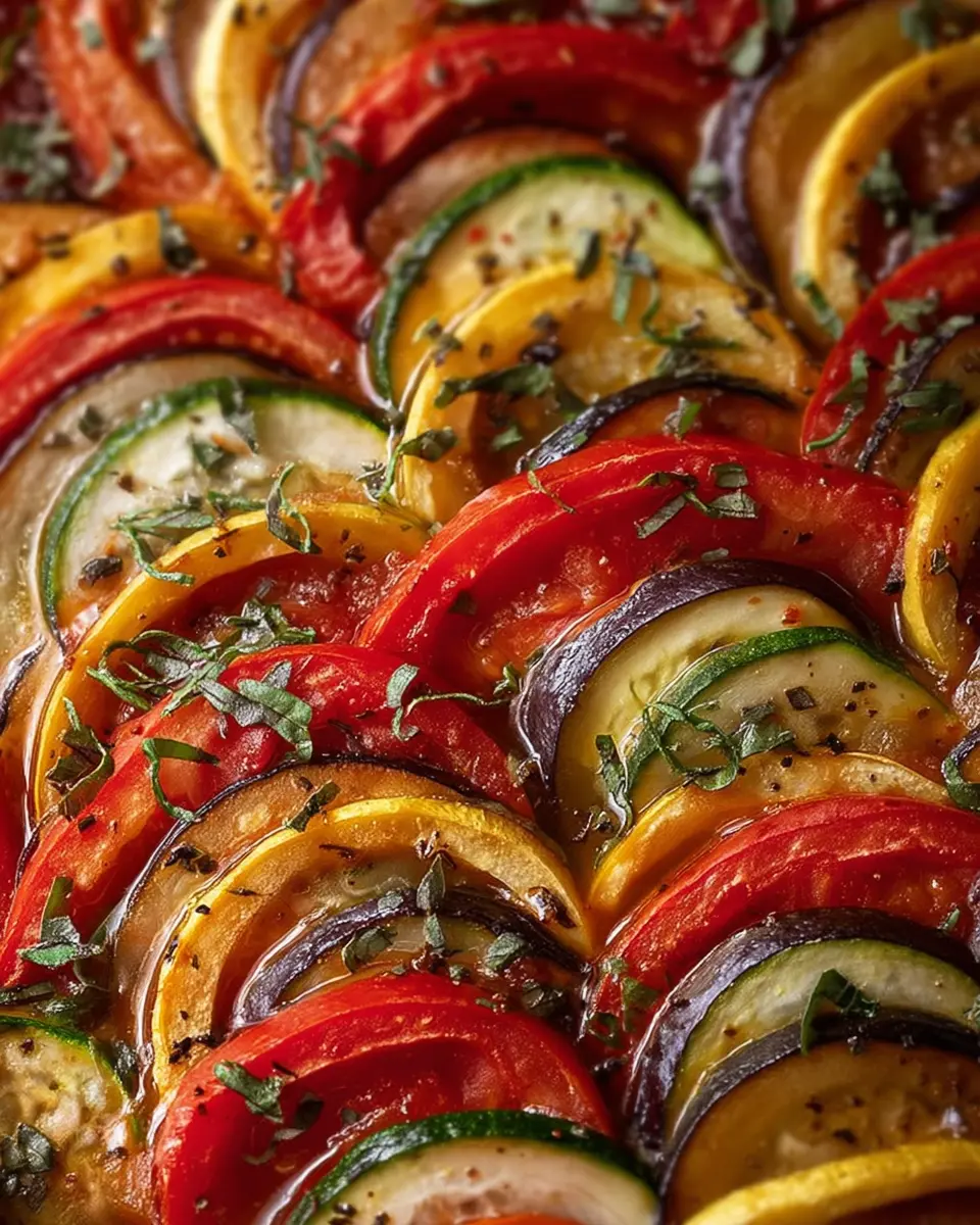 This is the fun part! Spread the flavorful sauce evenly across the bottom of the skillet, then start layering your sliced vegetables on top. Begin at the outer edge of the skillet and work your way in, alternating between zucchini, squash, eggplant, and tomato. The goal is to create a stunning spiral of colors that will make your ratatouille recipe truly eye-catching.