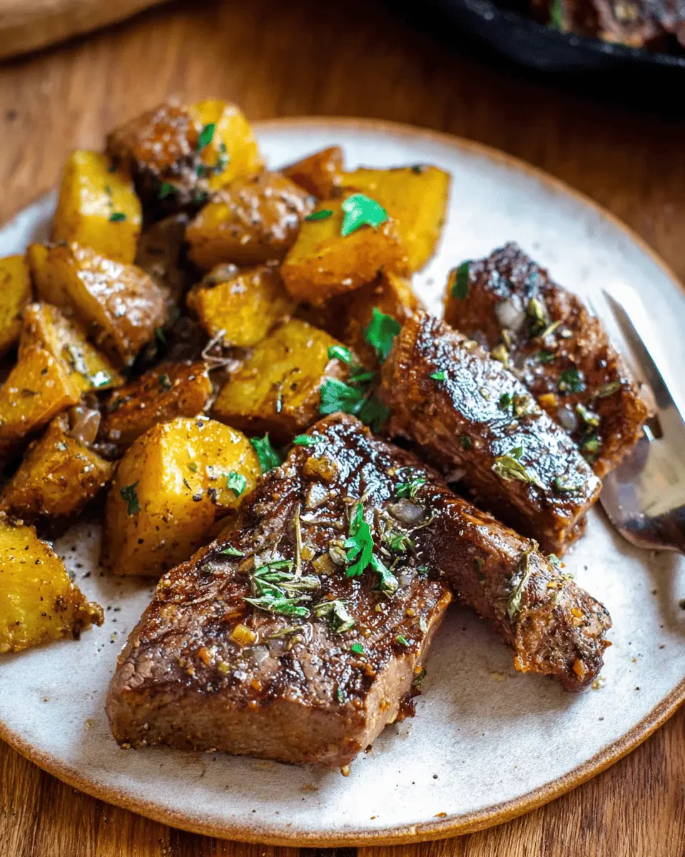 When serving steak and potatoes, the presentation can elevate the experience. Start by layering the potatoes artfully on the plate and topping them with the juicy steak bites. A sprinkle of freshly chopped parsley adds a pop of color, while a drizzle of melted garlic butter can bring everything together beautifully.
