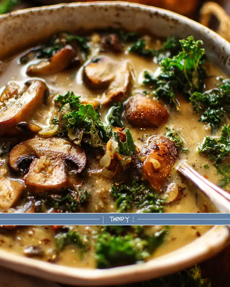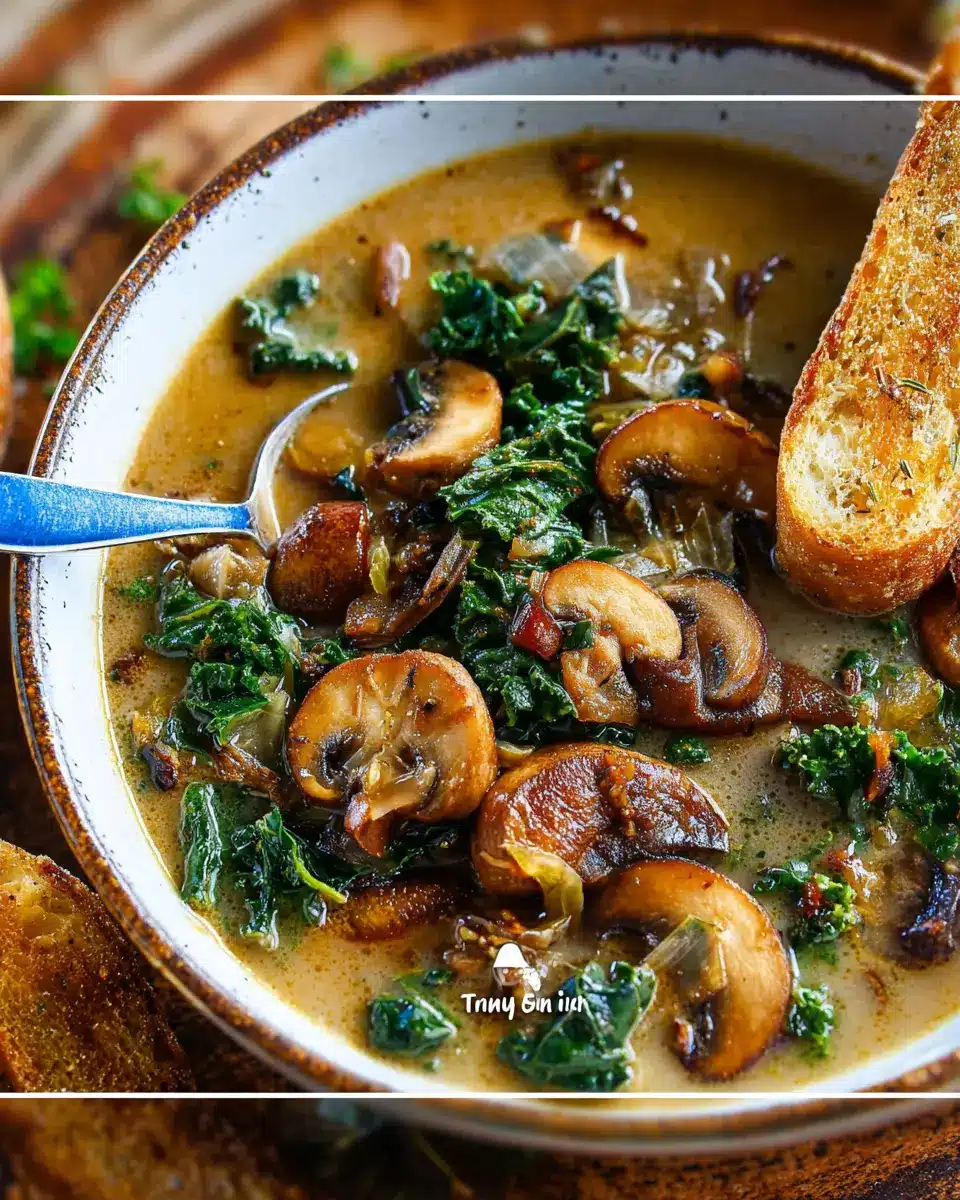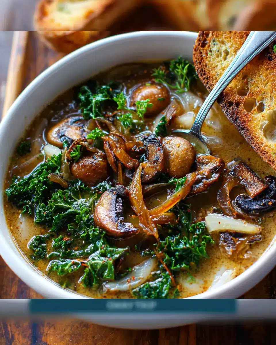 Wild Mushroom, Caramelized Onion and Kale Soup